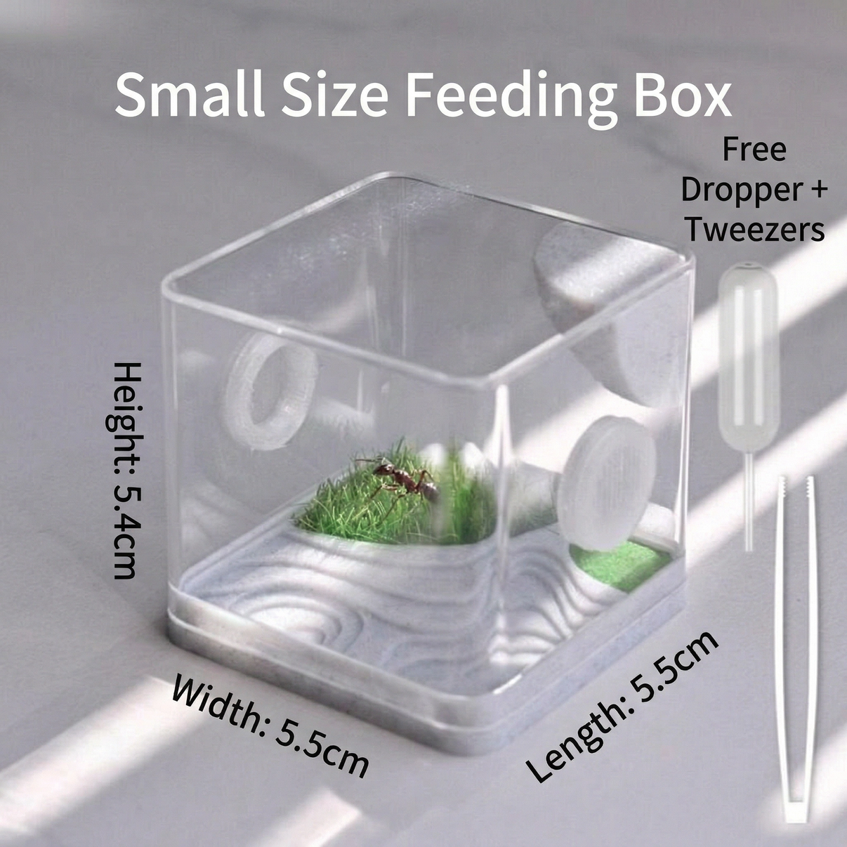 A tiny world they'll actually want to live in — terrace terrain base, side-entry feeding, and built-in humidity control. A clear acrylic enclosure designed specifically for jumping spiders, with a sculptural "terrace terrain" base in marble-textured resin. The base features a simulated grass landscape, a built-in humidification zone with external water inlet, and a removable plug to prevent leakage. The side-opening feeding port doubles as a ventilation vent with bilateral airflow — solving the common problem of top-fed enclosures being blocked by web spinning. A foam simulation hide on the inner wall provides a nest-like retreat. Includes dropper and tweezers.